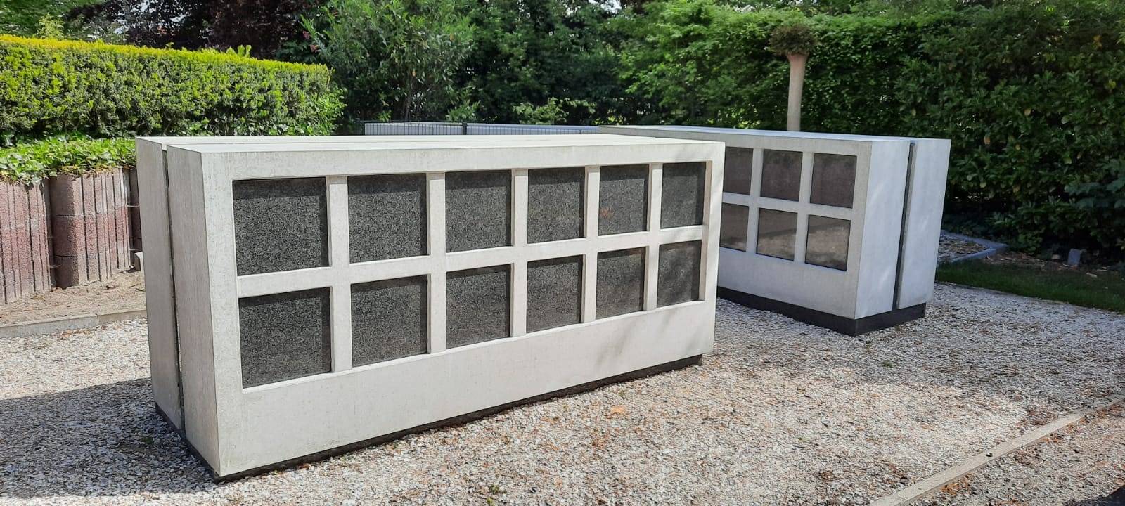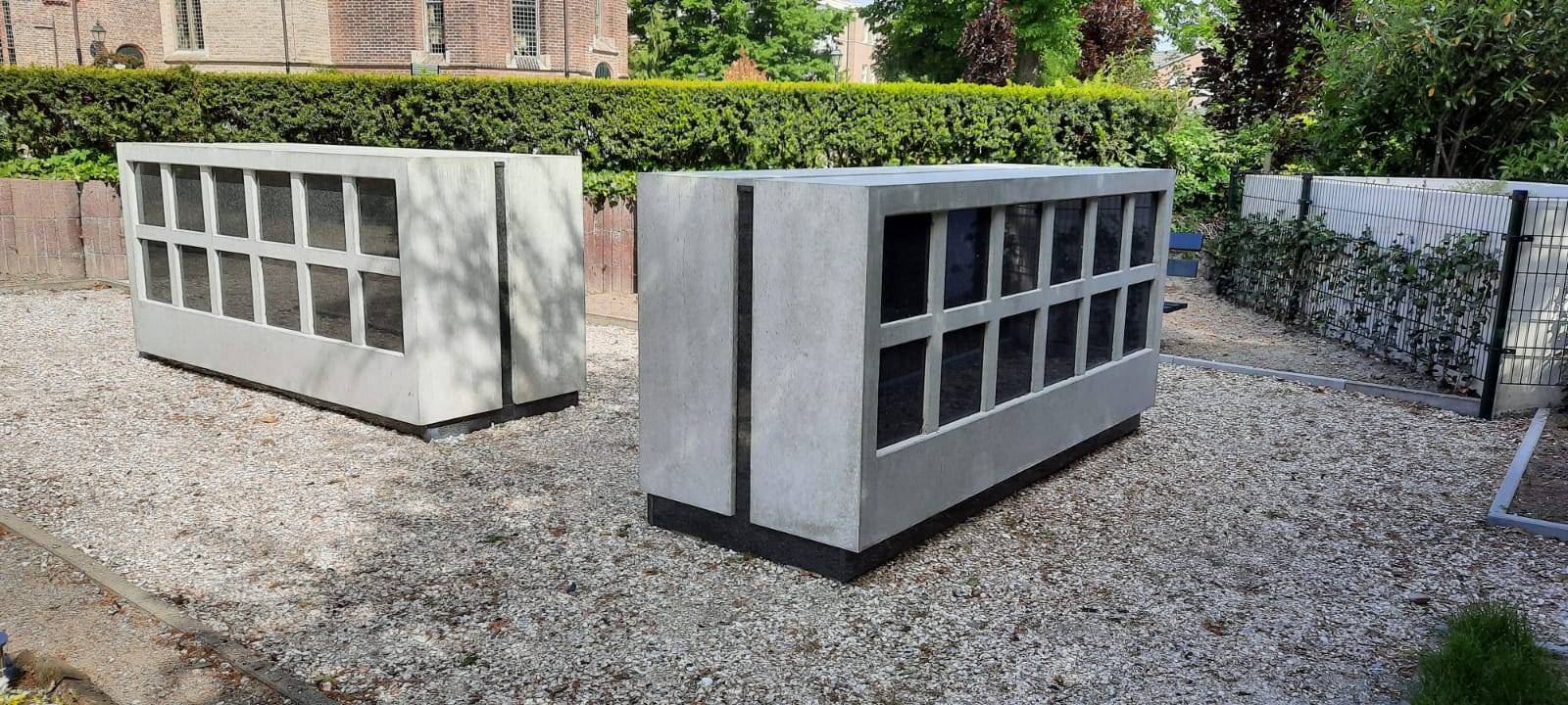 De modules van het Hilversum columbarium worden op sokkels geplaatst en rondom voorzien van granieten voetplaten.