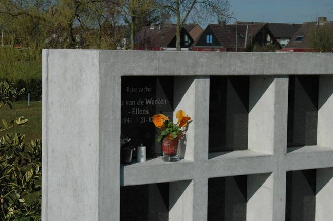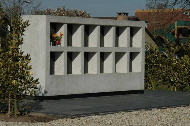 Hoogwaardige materialen vormen de basis voor het zelfverdichtende betonmengsel van dit columbarium. Tussen de nissen bestaan er geen voegen, waardoor de vormgeving in stand blijft.